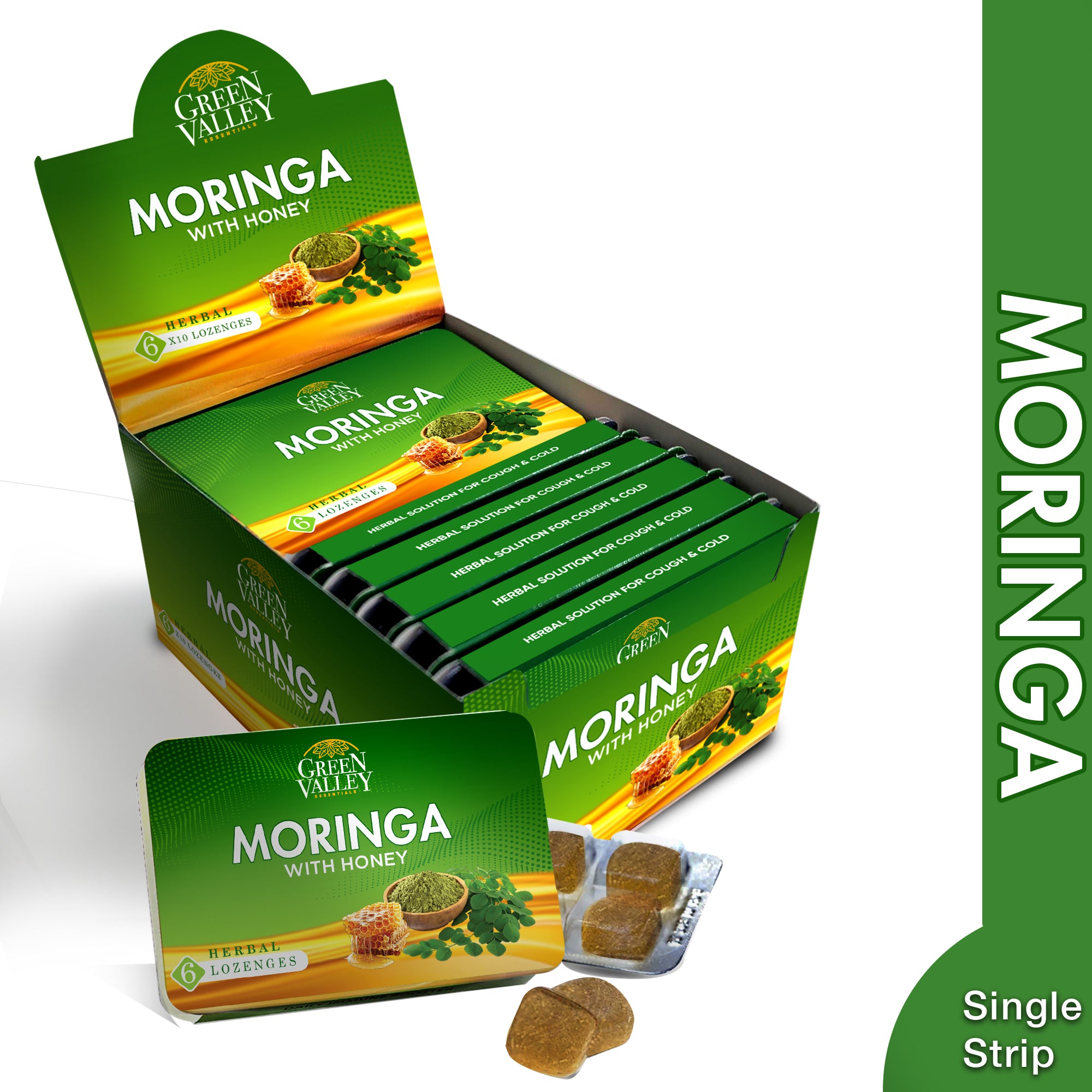 Green Valley Moringa Lozenge contains Moringa extract & Honey, both known for their rich natural nutrients and soothing properties. The combination of these two powerful ingredients helps strengthen immunity, provides relief in throat irritation, and supports overall respiratory health. It works effectively to ease discomfort caused by common cold, sore throat, and seasonal changes, giving you natural and gentle care.