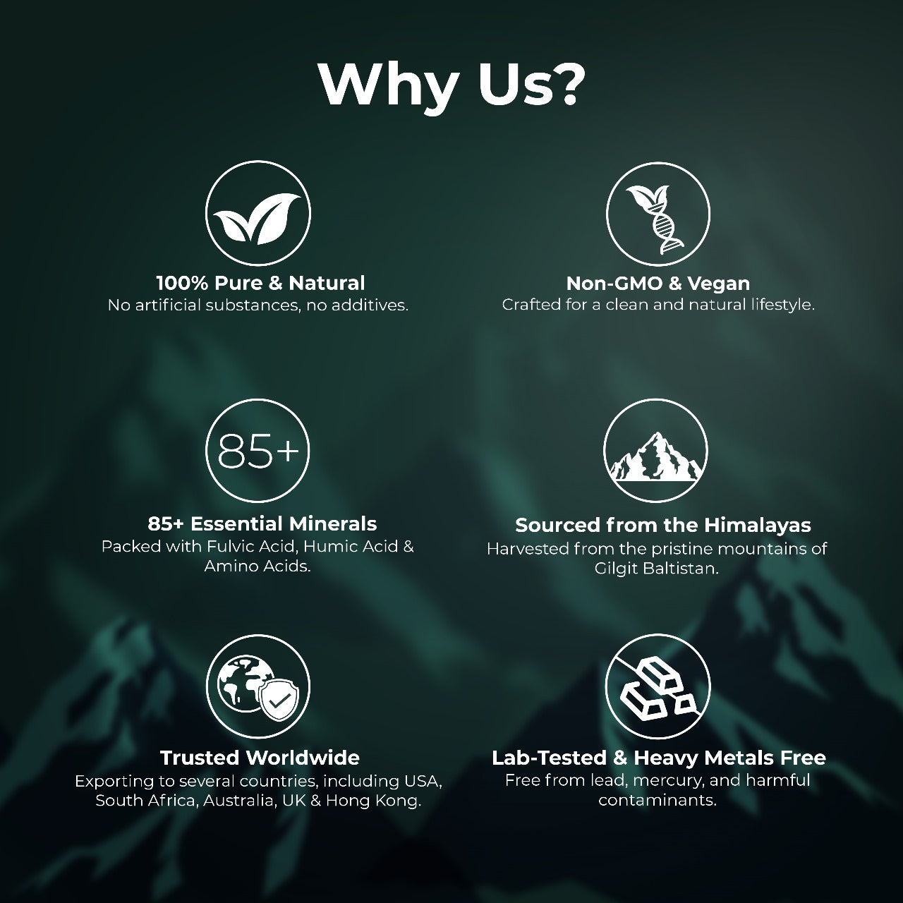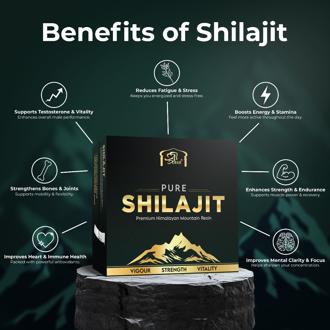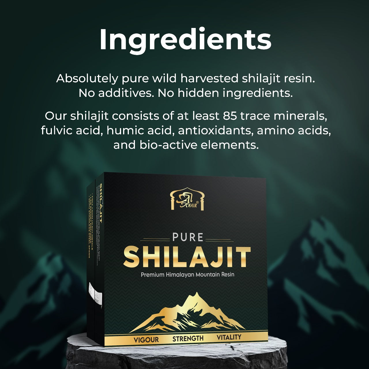 Shilajit is a natural, mineral-rich substance found in the Himalayas, known for its rejuvenating and healing properties. It has been used in traditional medicine for centuries to boost health and vitality. It is a rich bio-mineral mass composed of humus and decomposed plant remains, packed with fulvic acid, trace minerals, and other essential nutrients.