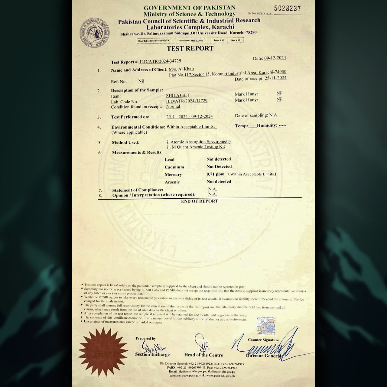 One of the key concerns with Shilajeet supplement is the potential presence of toxic heavy metals. AL Khair Shilajeet has been tested by Pakistan Council of Scientific & Industrial Research(PCSIR) which is an ISO certified research center and the results for lead, mercury, cadmium, and arsenic are within the permissible limits established by the World Health Orgazination (WHO).